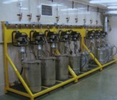 本公司非標工程設備包括大型液料輸送系統和各種噴房。大型供料輸送系統包括各種高壓中壓和低壓集中泵送系統,管道系統,控制系統,攪拌系統等。大型集中供漆系統將幾十臺輸送泵和攪拌系統集中安裝于調漆房,統一集中管理和控制,再由管道系統分配到每個噴房和每把噴槍。由于油漆分配,油漆攪拌調漆,泵送,控制都集中在調漆車間嚴格管理,統一控制,免除在噴涂車間搬運和灌裝油漆所帶來的火花和靜電危險,并節省小批次頻繁調漆所浪費的大量人工,同時保證了產品涂層的一致性。非標工程設備要到實地觀測廠房情況才能醞釀安裝和布局思路,結合用戶需求最終得出系統方案。